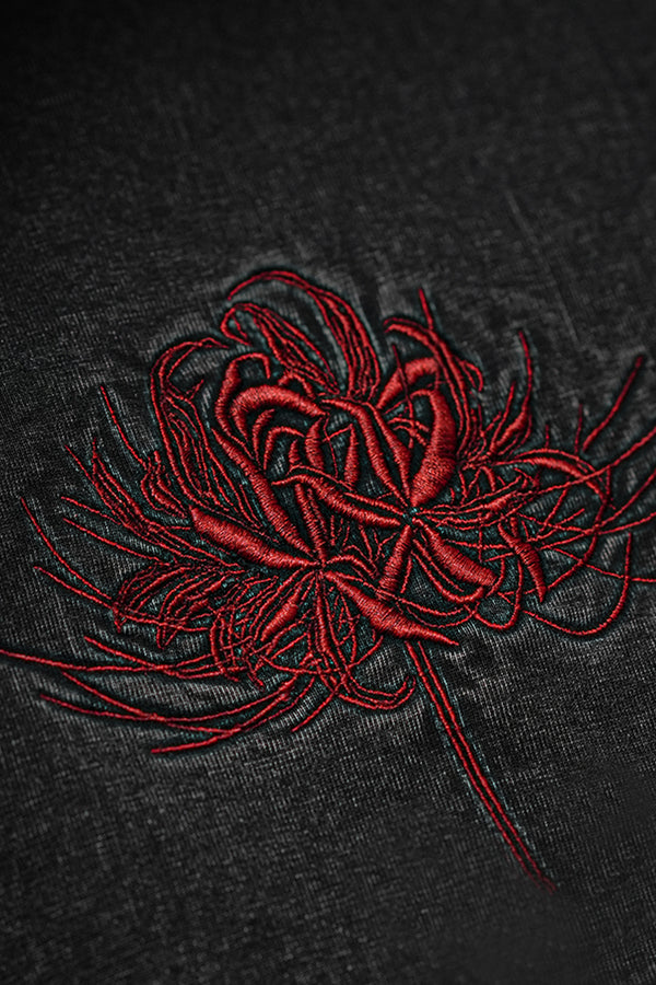 • Red 3D spider lily embroidery on the chest, symbolizing rebirth and pain